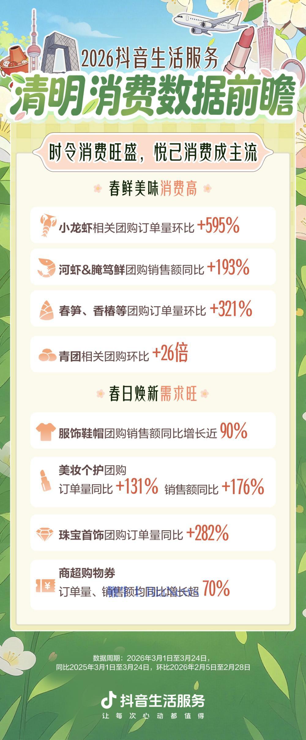 文旅市集火热以外,春日餐饮损失市集迎来爆发,应季好意思食损失升温。数据露出,“春茶”主题抖音团购订单量同比激增1223%,“樱花”主题饮品订单量增长362%,多款春日口味成为爆款。小龙虾关联团购订单量环比增长超595%。春笋、香椿等团购订单量环比增长321%。河虾、腌笃鲜关联团购销售额同比增长193%。青团团购订单量更是环比增长26倍。