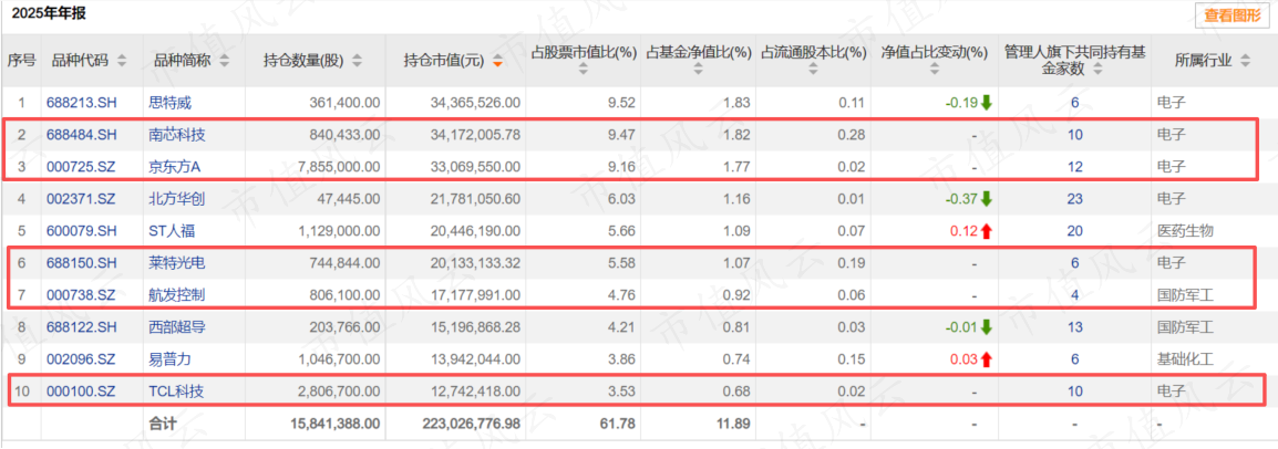 具体到握仓股,2025年四季度末,前十大重仓股中有5只新进,包括面板龙头京东方A、TCL科技、OLED屏幕材料龙头莱特光电和主攻糜费电子及汽车芯片目的的南芯科技。