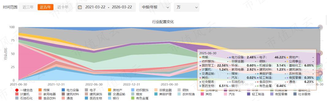 化工、机械拓荒板块则履历了先加后减的经由,而国防军工板块握续获加仓,法例2025年中报握仓比例已跳动22%。