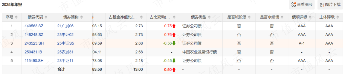 重仓的债券多为3A级的证券公司债,包括21广发06、23申证02、25中证S5等。