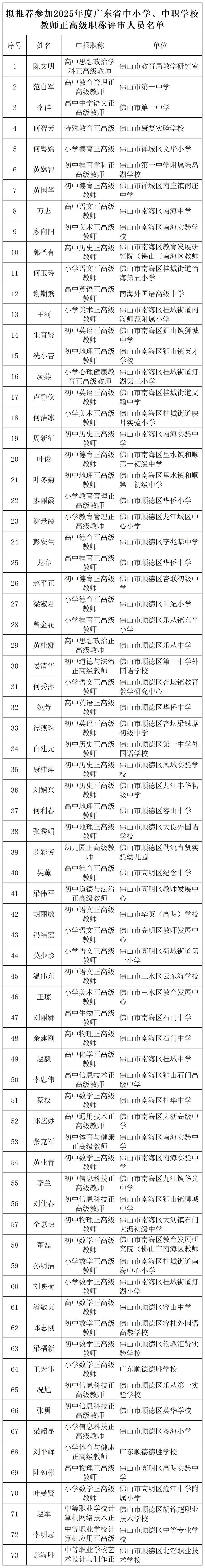 字据《广东省教学厅对于作念好2025年度中小学进修职称评审使命的见告》《广东省教学厅对于作念好2025年度中职进修职称评审使命的见告》条件,雅博体育app中国官网入口我局拟推选陈时髦等73东说念主投入2025年度广东省中小学、中职学校进修正高档职称评审,现将拟推选参评东说念主员名单给予公示(见附件)。