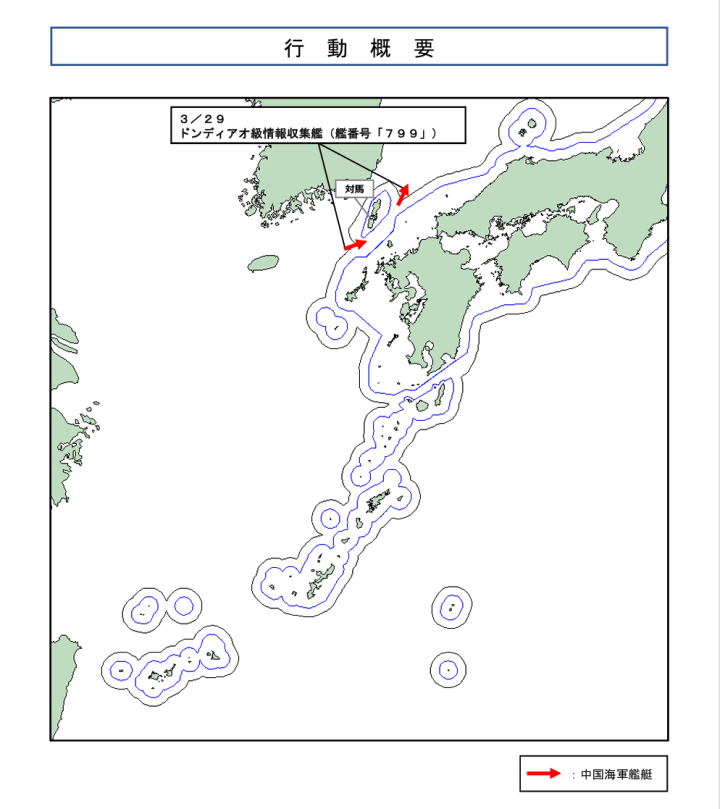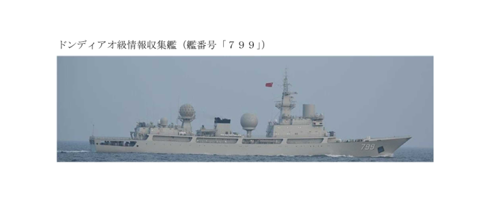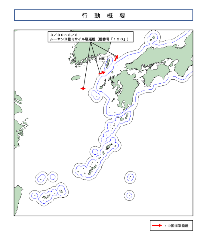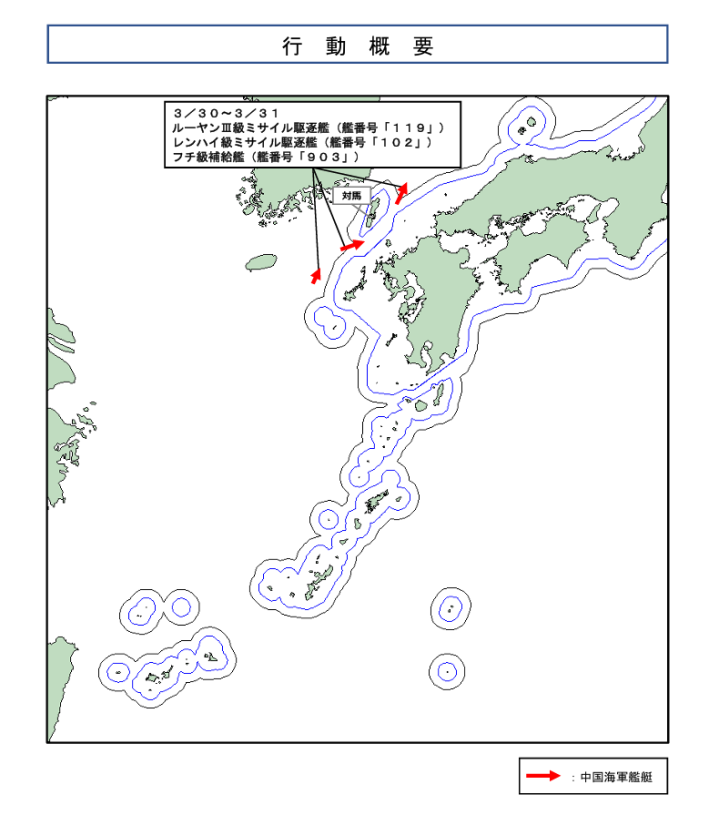 驻扎省·自保队已派出海上自保队第 3 警告扫视队驻佐世保基地所属“隼”级导弹艇PG-826 “大鹰” 号 “大鹰” 号及驻厚木基地第四航空群所属川崎P-1反潜巡查机,推行警告监视与谍报汇集 。
