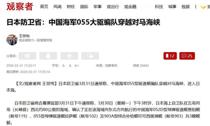 证实日本严防省我方吓得左摇右晃发布的音讯,三月三十一日那天,中国舟师的“住持旦角”——055型大型结束舰编队,大摇大摆地穿越了对马海峡,径直干与了日本海。